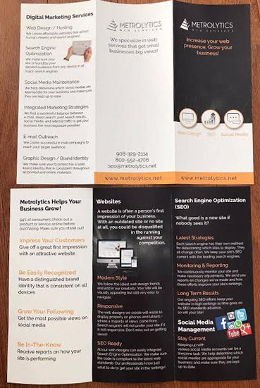 At Metrolytics Web Services, I was the marketing manager. I created promotional materials such as brochures and post cards, designed and developed the website, and rebranded with a new logo design. I helped obtain new clients through calls and in-person meetings. I also did the SEO/SEM/Social Media for many of the web clients.